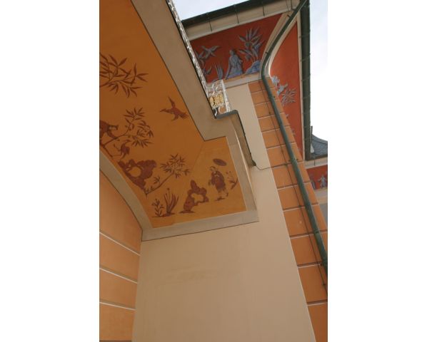Bergpalais ist in Dachform und Fassadengestaltung sichtbar durch den chinoisen Stil geprägt. Kurz